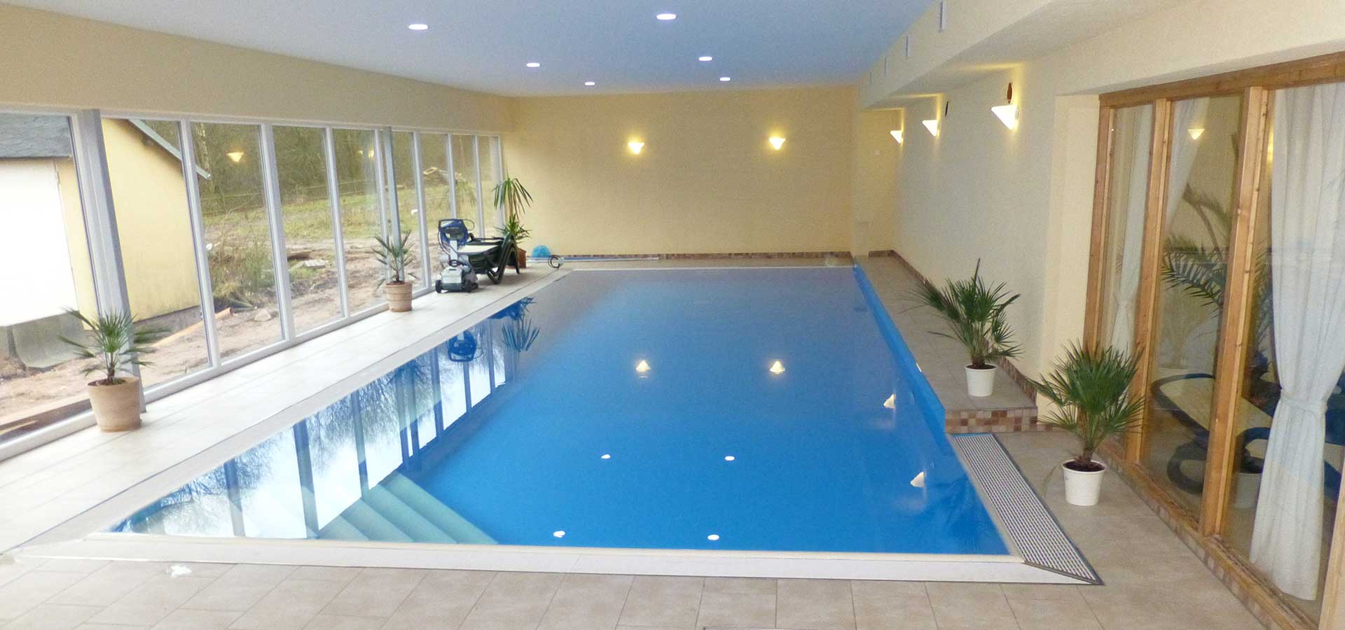 Eine ebenfalls installierte Wärmepumpe sorgt für die angenehme Wassertemperatur. Um den Temperaturverlust so gering wie möglich zu halten, wurde eine Rolladenabdeckung (Firma Swimroll Herrmann) installiert, die in den Ruhezeiten des Beckens Verwendung findet.