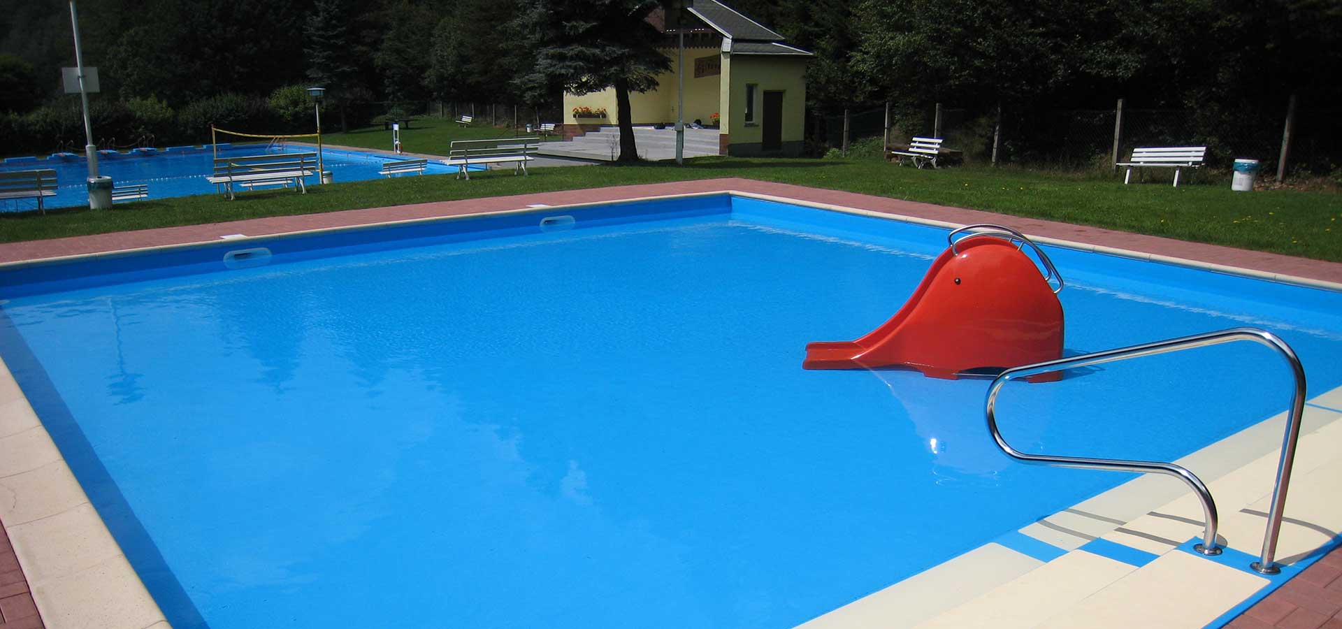 Das alte Planschbecken im Freibad Steinbach-Hallenberg (Baujahr 1936) war als Betonbecken ohne Aufbereitung dringend sanierungsbedürftig. Um eine kindgerechte Wassertemperatur und Wasserbeschaffenheit zu gewährleisten, hat man den Beckenkörper komplett neu gestaltet. Eine stahlarmierte Betonkonstruktion mit Styropor-Isolierschalsteinen bildet den Beckenkörper des neuen Planschbeckens. Adriablaue PVC-Schwimmbadfolie wurde fachgerecht verlegt und verschweißt und gibt dem neuen Becken seine typische Schwimmbadfarbe. Mittels Einlaufdüsen und Skimmer wurde eine horizontale Längsdurchströmung geschaffen. Die Desinfektion des Wassers erfolgt mit Calciumhypochlorit. Eine höher gelegene Plattform mit sandfarbenen Beckenrandsteinen bildet einen optimalen Beckenabschluss und eine gute Sitzgelegenheit für die Eltern der kleinen Gäste. Im Mai 2014 konnte das fertiggestellte Planschbecken mit großer Resonanz in Betrieb genommen werden.