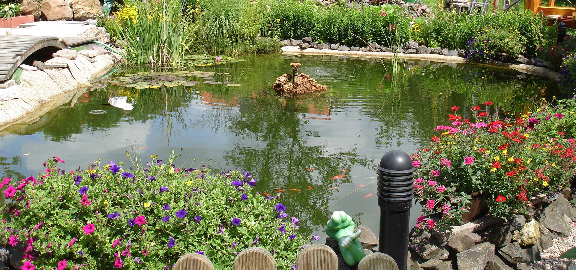 Steinsegmente, Wasserpflanzen und ein integrierten Brunnen sorgen für die optische Aufwertung der Teichanlage.